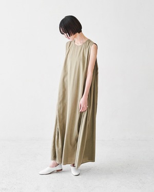 This sleeveless long dress is made of luxuriously smooth and shiny cotton satin fabric. The generous gathers at the sides are neatly trimmed at the front for a clean look. It can be worn alone without worrying about transparency.