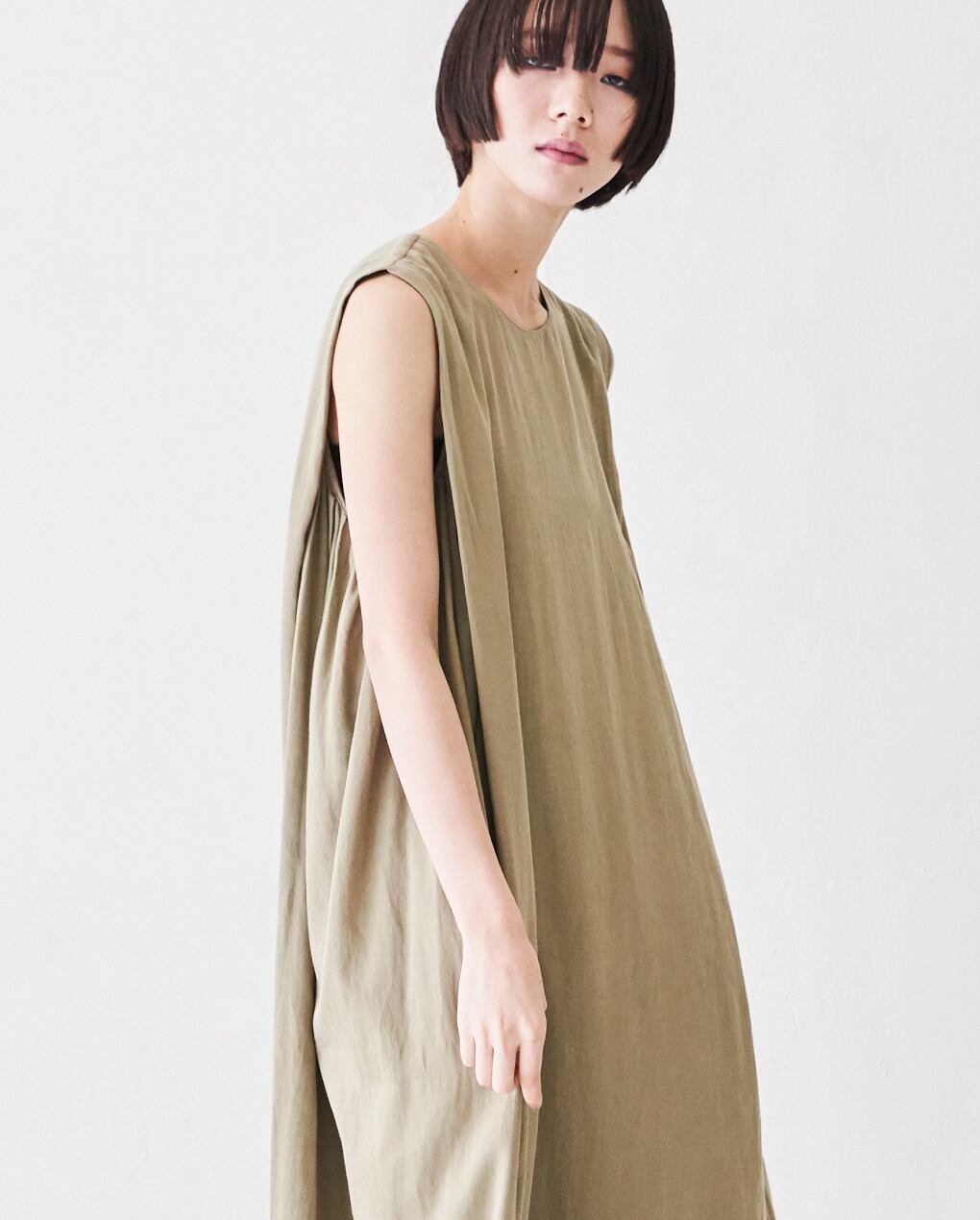 とろんと滑らかでツヤのあるコットンサテン生地を贅沢に使った、ノースリーブのロングワンピース。サイドのたっぷりなギャザーも、フロントの潔さでスッキリとした印象に。透け感が気にならず一枚でも着ていただけます。