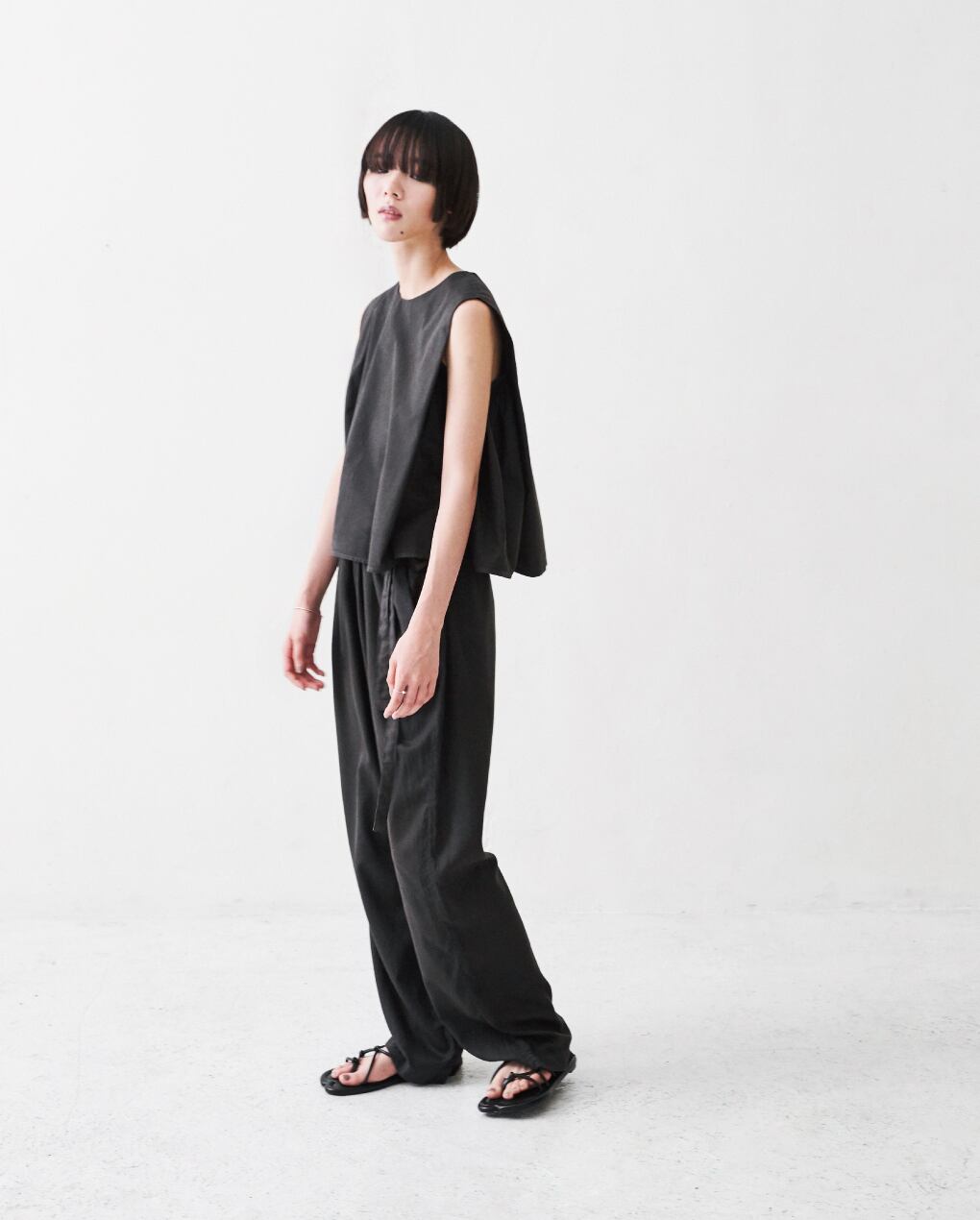This sleeveless blouse is made of a slightly bouncy broadcloth fabric. While giving a sleek impression, the gathers on the sides are cute and can be enjoyed from all angles. It goes great with this season's bottoms, such as back gathered tapered pants and satin straight pants.