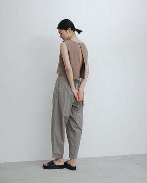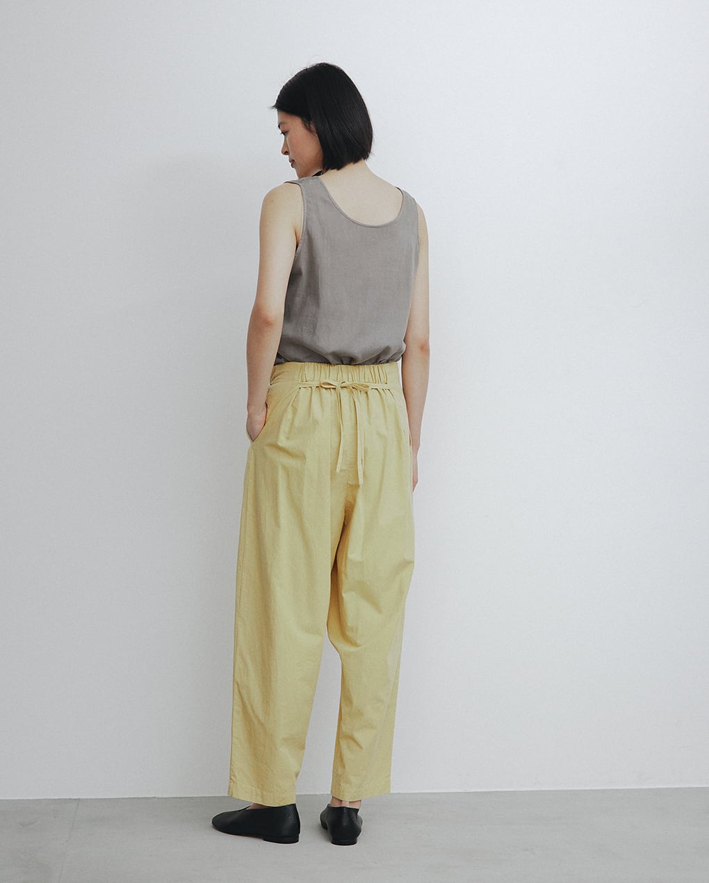 Tapered pants that were well received in the 1st collection. They are now available again in a new color. The broadcloth fabric has a sense of bounciness and is smooth to the touch. Because they are loose-fitting, they can be worn all year round with an inner layer. Available in two sizes, this classic item is also popular with men.