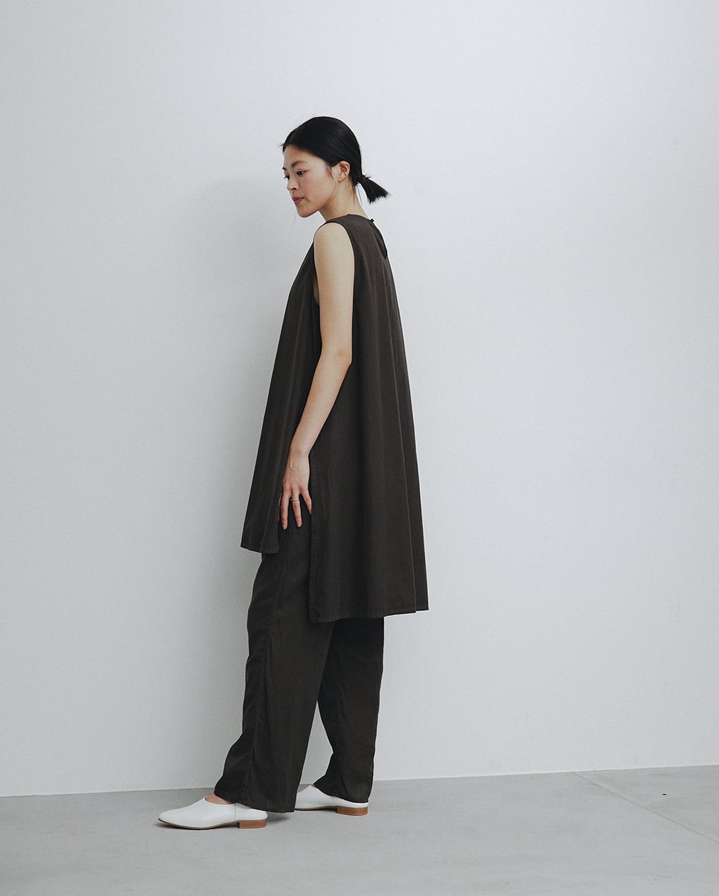 This long vest can be worn lightly as a single piece or as a more layered style. It is made of a lightweight broadcloth with a sense of resilience, and the key point is the balance between the front and back lengths. The large slits on the sides allow easy access to the bottom pockets, and the sides are wide open for ease of movement and comfort. It goes great with this season's camisole dresses and sheer pants. Please enjoy various combinations with your simple cut-and-sew or knitwear.