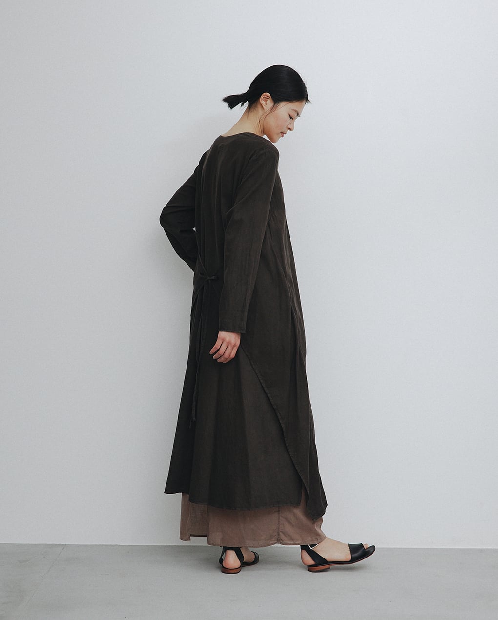 1stコレクションでその肌触りに魅了された方も多いコットンサテンを、今回もたっぷり贅沢に使って長袖のワンピースを作りました。大胆な胸元のVネック、すっきりとしたフロントの印象と、バックスタイルの可愛さのギャップがたまらない一着。紐の結び方でランダムに揺れる裾の動きもポイントです。