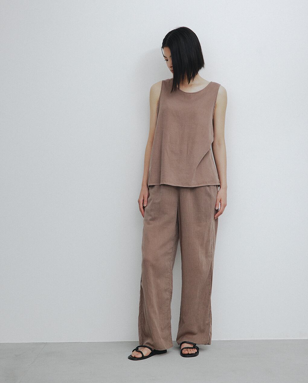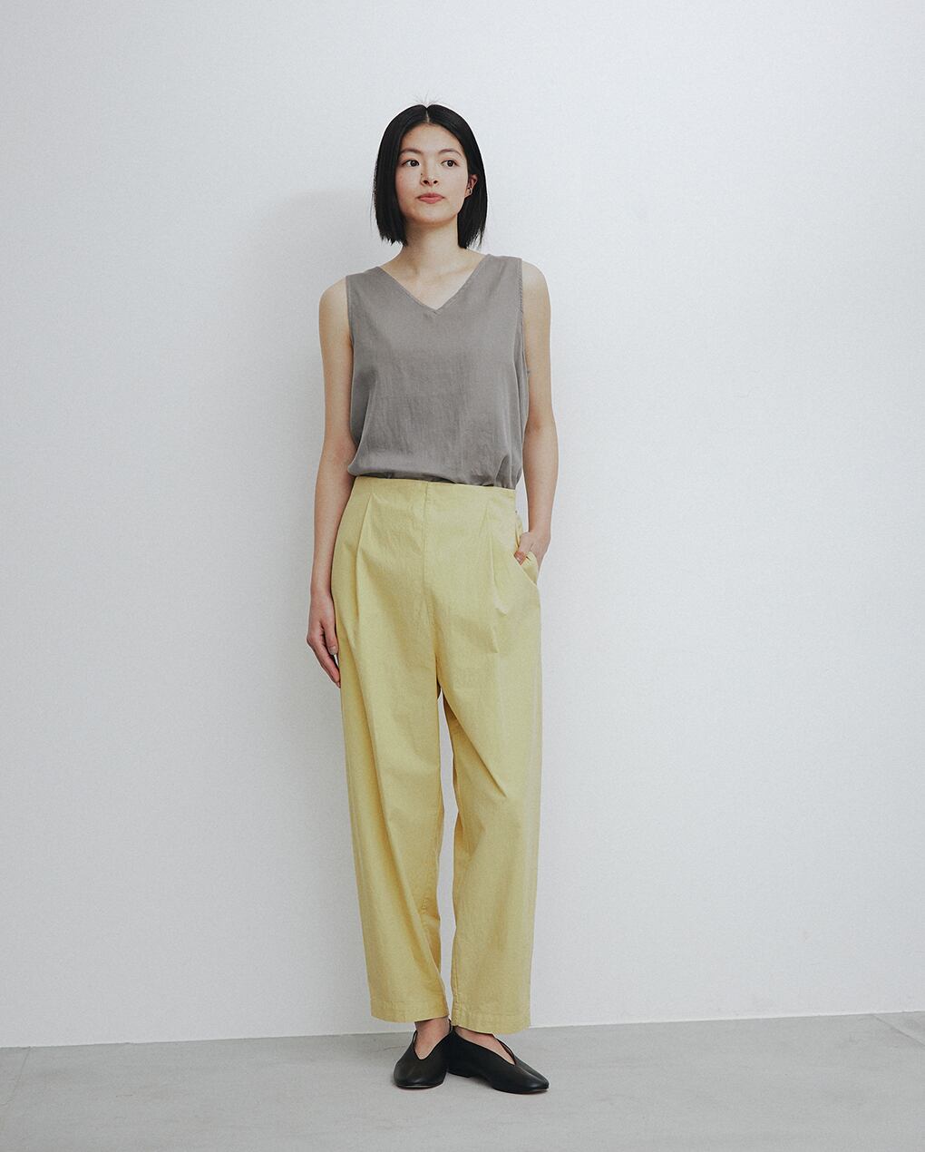 Tank tops, which were popular in the 1st collection, join the standard items! This 2-way tank top is made of smooth cotton satin fabric. Depending on your mood or outfit, you can choose between a U-neck or V-neck. The shiny fabric and sleek design give it an elegant impression without being too casual. It is an excellent item that can be worn easily on its own as an inner layer for a dress or with SOMEYA bottoms.