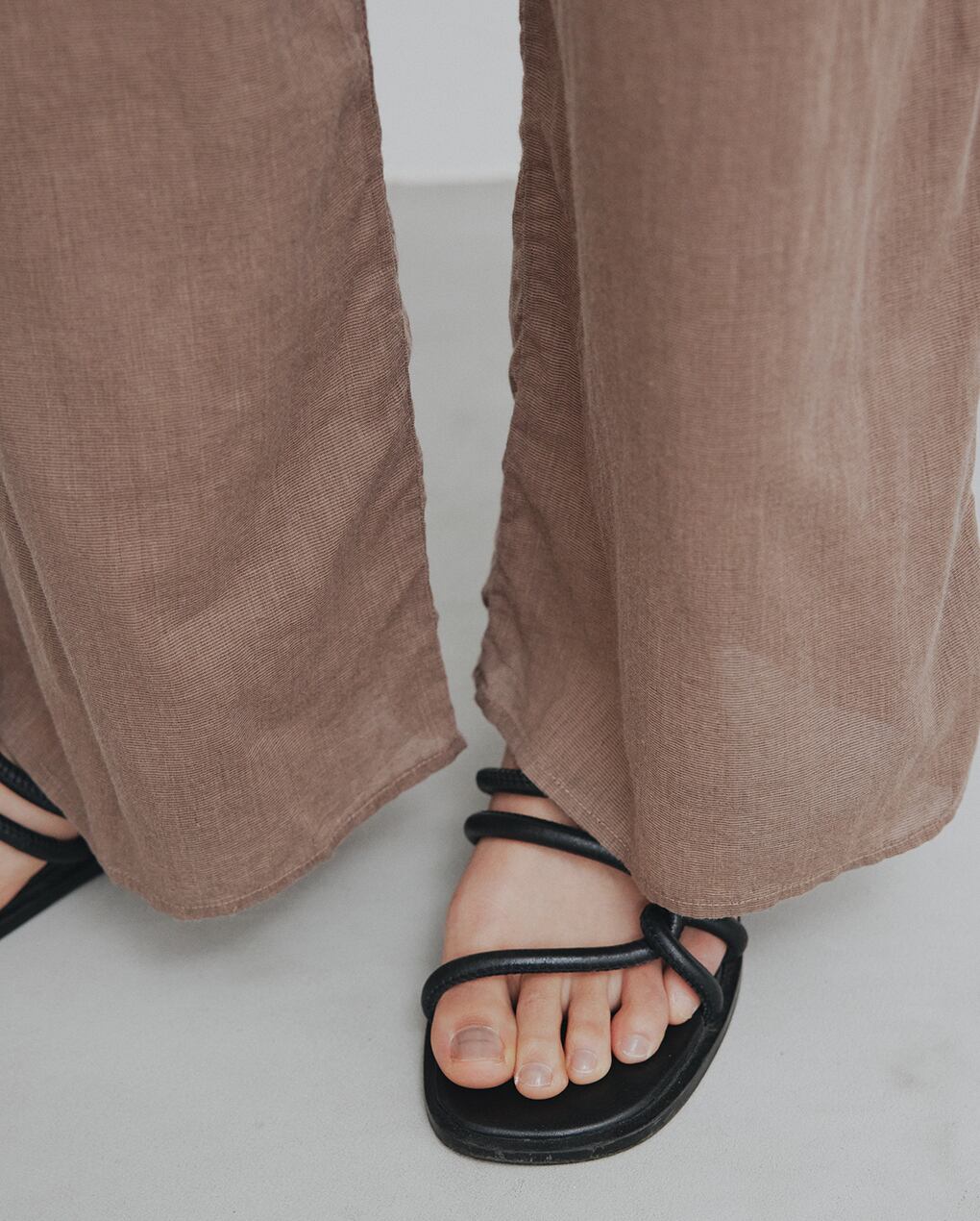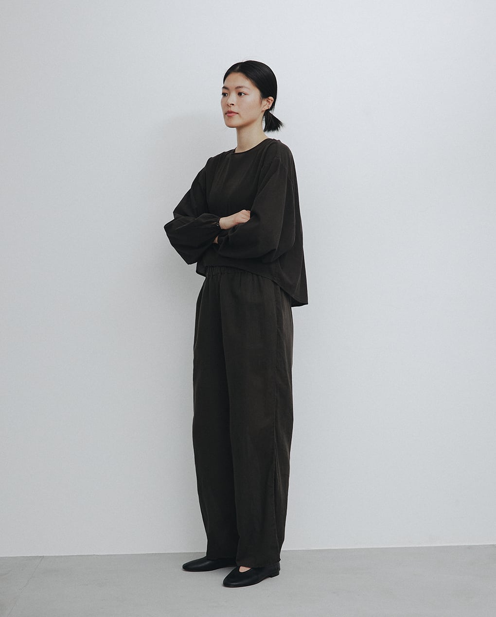 透け感がポイントの、ワイドなストレートパンツ。印象も着心地も軽やかで、ウエストゴムがさらに身体をリラックスさせてくれます。太ももから上は裏地が付いているため、一枚でご着用いただけます。ワンピースなど丈の長いトップスと合わせて、裾だけ見せるのも素敵です。両サイドにはポケット付き。